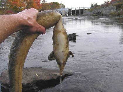 Eels are our only catadromous fish species, spawning in the ocean and living in freshwater rivers for 15-50 years before attempting to out-migrate back to their spawning grounds in the Sargasso Sea. The American eel, ranging from northern South America to Greenland and up the Mississippi is but one of many species worldwide with similar life cycles. Unfortunately, most all are threatened due primarily to over-fishing (the sweet, succulent and caloric eel was in large part responsible for the survival of America’s first settlers) and from turbine mortality caused as they attempt to out-migrate through hydroelectric dams.