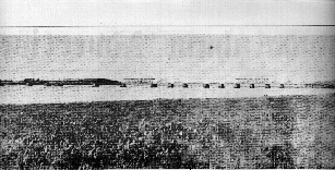 The bridge was 2,700 feet in length, with a wooden deck 24-feet wide. It was supported first on wooden pilings set 20 feet apart in the shifting river sands; then, when ice and currents became a problem, rocks were added around the pilings to protect them. Still later, improvements projects on the bridge led to replacement of the wooden pilings with granite block supports.